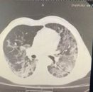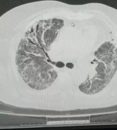 Imagine CT torace la pacient admis în secția de pneumologie, imediat după negativarea infecției SARS-CoV-2. Se observă leziuni cu tendință evolutivă spre fibrozare mai ales la baza dreaptă, cu tendință de retracție și dezvoltare de bronșiectazii.