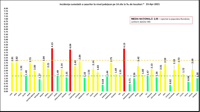 Un număr de 25 judeţe se regăsesc în zona galbenă (incidenţă între 1,5 şi 3), cele mai ridicate rate de infectare fiind în Braşov şi Covasna – 2,84, Arad – 2,82, Alba – 2,81, Hunedoara – 2,75.