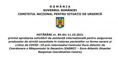 Comitetul Național pentru Situații de Urgență (CNSU) a aprobat în ședința de luni Hotărârea numărul 84 privind aprobarea solicitării de asistență internațională pentru asigurarea produselor de strictă necesitate în tratarea pacienților cu forme severe și critice de COVID -19 prin intermediul Centrului Euro-Atlantic de Coordonare a Răspunsului la Dezastre (EADRCC – Euro-Atlantic Disaster Response Coordination [mai mult]