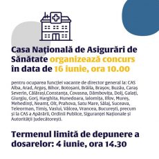 Casa Națională de Asigurări de Sănătate organizează o nouă sesiune de concurs pentru ocuparea funcțiilor vacante de director general la casele județene, se arată într-un anunț al instituției. Termenul limită pentru depunerea dosarelor este data de 04 iunie, până la ora 14.30. Potrivit CNAS, proba scrisă va avea loc în data de 16 iunie 2021, [mai mult]