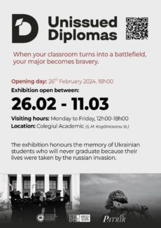 Centrul de Cooperări Internaționale al Universității Babeș-Bolyai (UBB), împreună cu Institutul Român pentru Pace (PATRIR) și cu sprijinul Direcției Patrimoniu Cultural Universitar al UBB, organizează luni, 26 februarie 2024, în Foaierul Colegiului Academic (str. M. Kogălniceanu, nr. 5), vernisajul expoziției „Unissued Diplomas”, dedicată studenților ucrainieni care și-au pierdut viața în contextul invaziei rusești. Unissued Diplomas [mai mult]