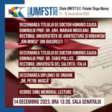 Universitatea de Medicină, Farmacie, Științe și Tehnologie „George Emil Palade” din Târgu Mureș invită întreaga comunitate academică să participe, joi, 14 decembrie, ora 13.30, în Sala Senatului, cu ocazia Zilelor prodigioase instituții, la decernarea titlului „Doctor Honoris Causa” rectorului Universității de Arhitectură și Urbanism „Ion Mincu” din București, prof. dr. arh. Marian Moiceanu și cel [mai mult]