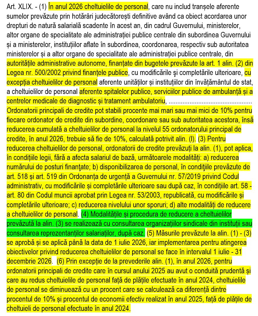 Federația subliniază că toate deciziile legate de personal vor fi luate doar după consultarea organizațiilor sindicale din unități (Art. XLIX, alin. (3)), asigurând protecția fiecărui membru de sindicat din instituțiile în care se vor aplica măsurile de austeritate. Consultările și negocierile au început deja înainte de publicarea ordonanței, la nivelul Ministerului Sănătății, care a garantat că nu vor fi afectate nici Centrele de transfuzii sanguine, nici Agenția Națională de Transplant, Institutul de Medicină Legală sau Medicina Școlară.