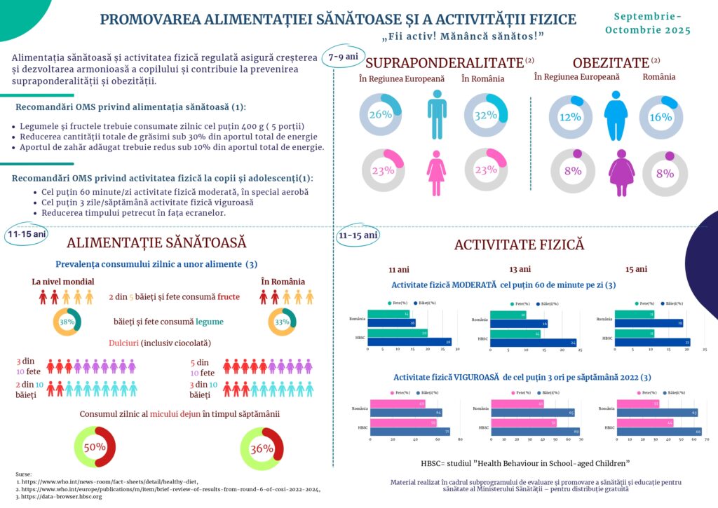 În perioada septembrie – octombrie 2025, Institutul Național de Sănătate Publică (INSP) derulează la nivel național campania de informare și educație „Fii activ, mănâncă sănătos!”, menită să promoveze beneficiile alimentației sănătoase și ale activității fizice pentru prevenirea bolilor cronice și îmbunătățirea stării generale de sănătate.