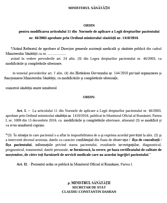 Proiectul de ordin vizează modificarea articolului 11 din Normele de aplicare a Legii drepturilor pacientului.
