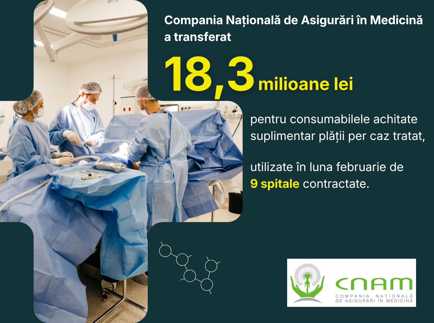 Peste 18 milioane de lei au fost alocate în februarie de Compania Națională de Asigurări în Medicină (CNAM) pentru achiziția de consumabile medicale utilizate în intervenții chirurgicale complexe, menite să restabilească funcțiile diferitelor organe și membre.