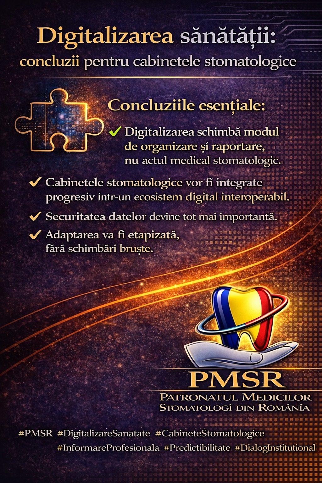 În contextul acestor schimbări, PMSR subliniază că informarea corectă, dialogul profesional și predictibilitatea sunt cruciale, astfel încât digitalizarea să fie aplicabilă și proporțională cu nevoile stomatologilor și pacienților.