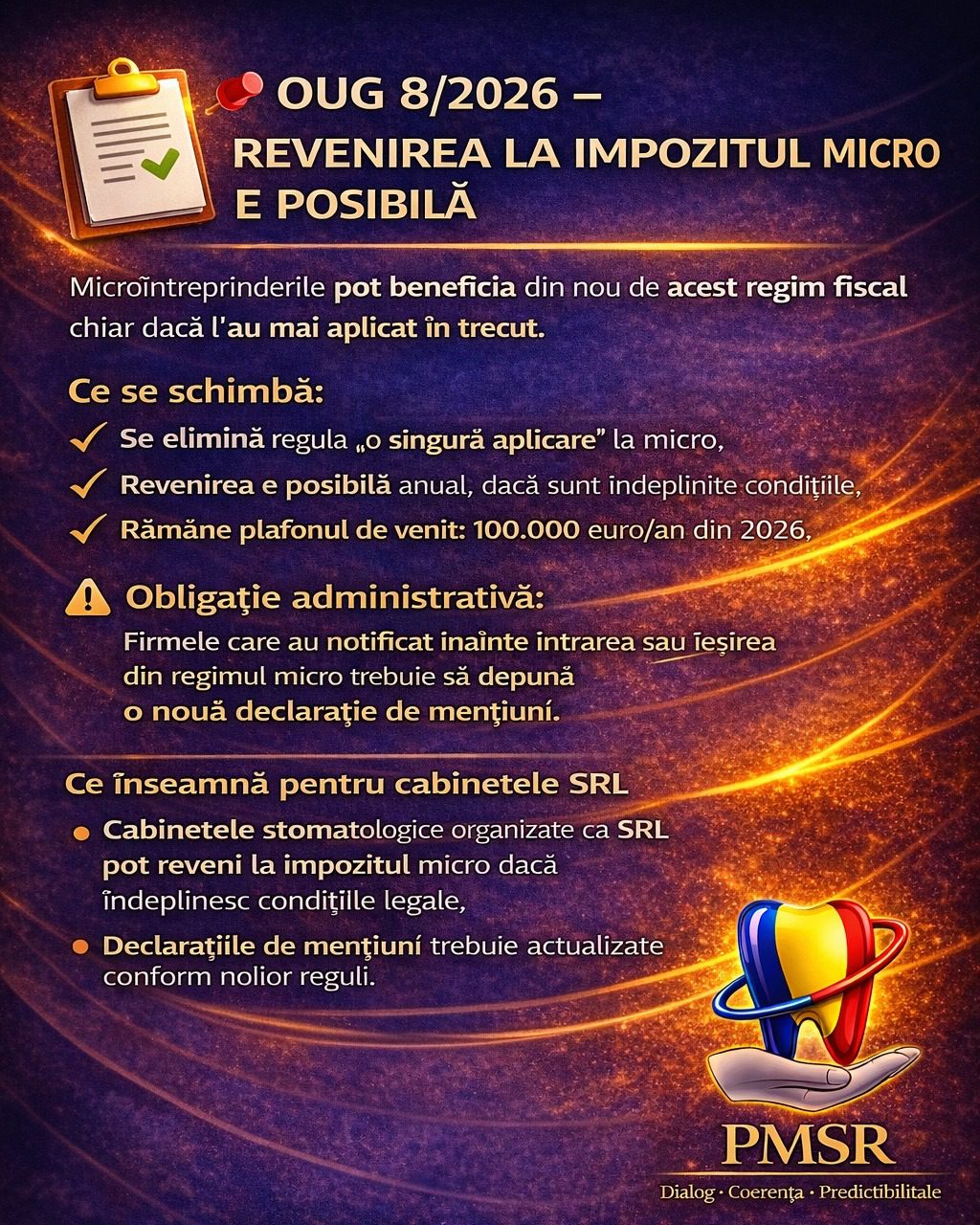 OUG 8/2026 aduce o modificare importantă a Codului fiscal, permițând firmelor, inclusiv cabinetele stomatologice organizate ca societăți comerciale, să revină la regimul de impozitare pe veniturile microîntreprinderilor, chiar dacă l-au mai aplicat anterior, anunță Patronatul Medicilor Stomatologi din România (PMSR). Până acum, după ieșirea din regimul micro, revenirea nu era posibilă.