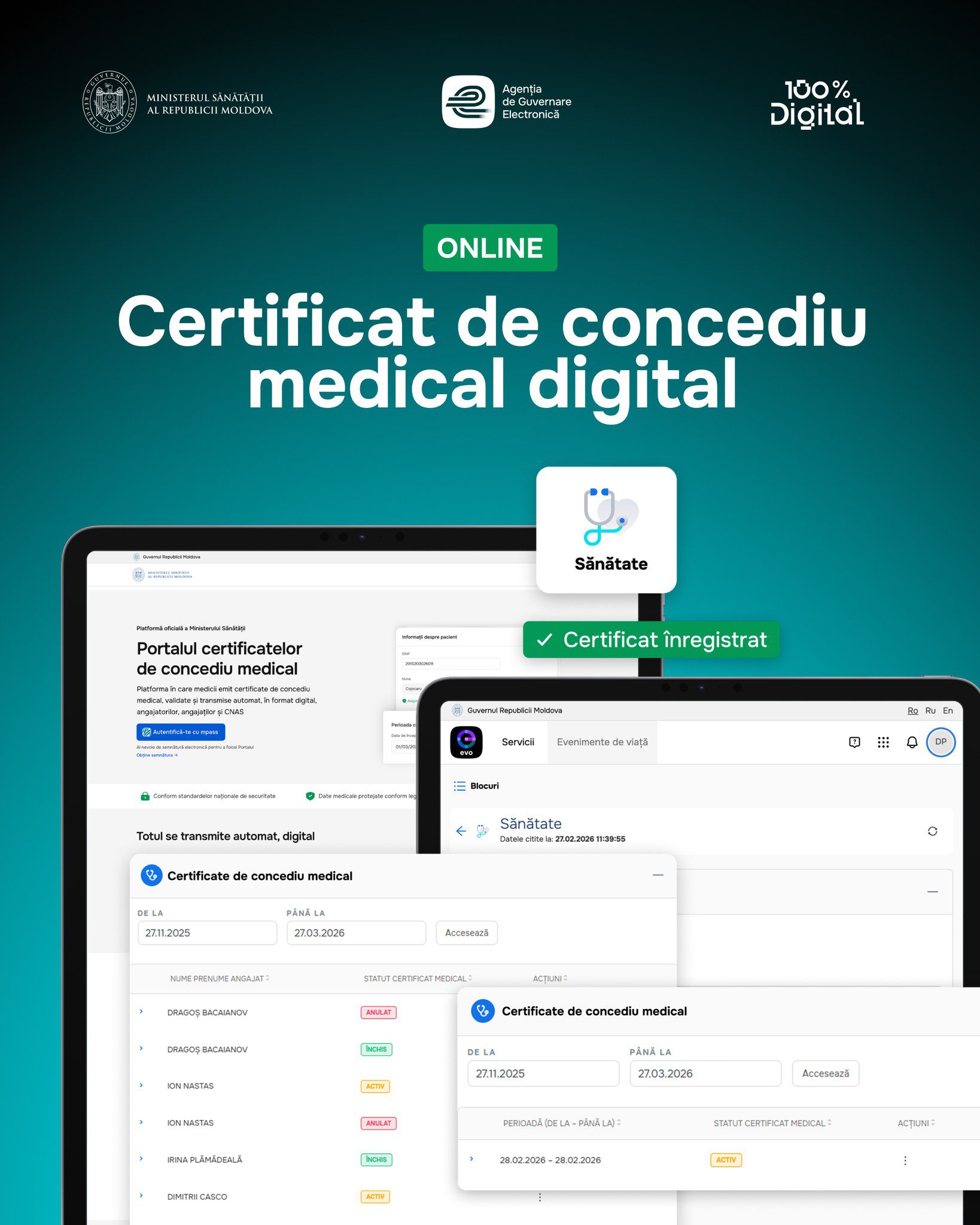 „Ministerul Sănătății, în colaborare cu Agenția de Guvernare Electronică, a lansat Portalul certificatelor de concediu medical – un pas care aduce beneficii deopotrivă pentru medici, angajatori, pacienți și stat. Noul sistem asigură circulația automată a informației între medic, angajator și CNAS, reduce erorile și oferă trasabilitate completă. Până în prezent, 4500 de certificate au fost emise în format digital”, a declarat ministrul Emil Ceban.
