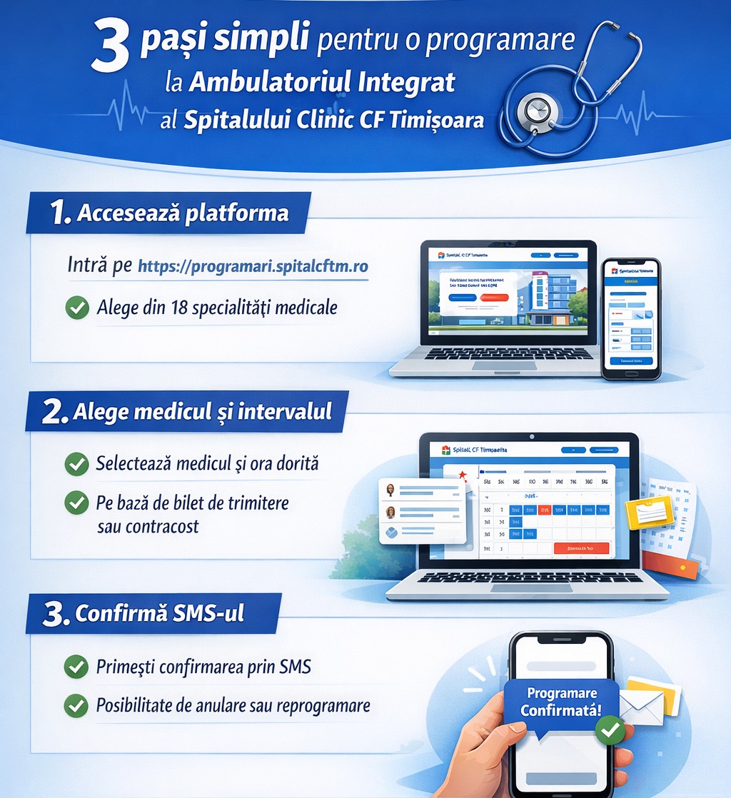 Spitalul Clinic CF Timișoara a lansat un sistem simplificat de programări online pentru Ambulatoriul Integrat, menit să crească accesibilitatea și eficiența serviciilor medicale oferite pacienților.