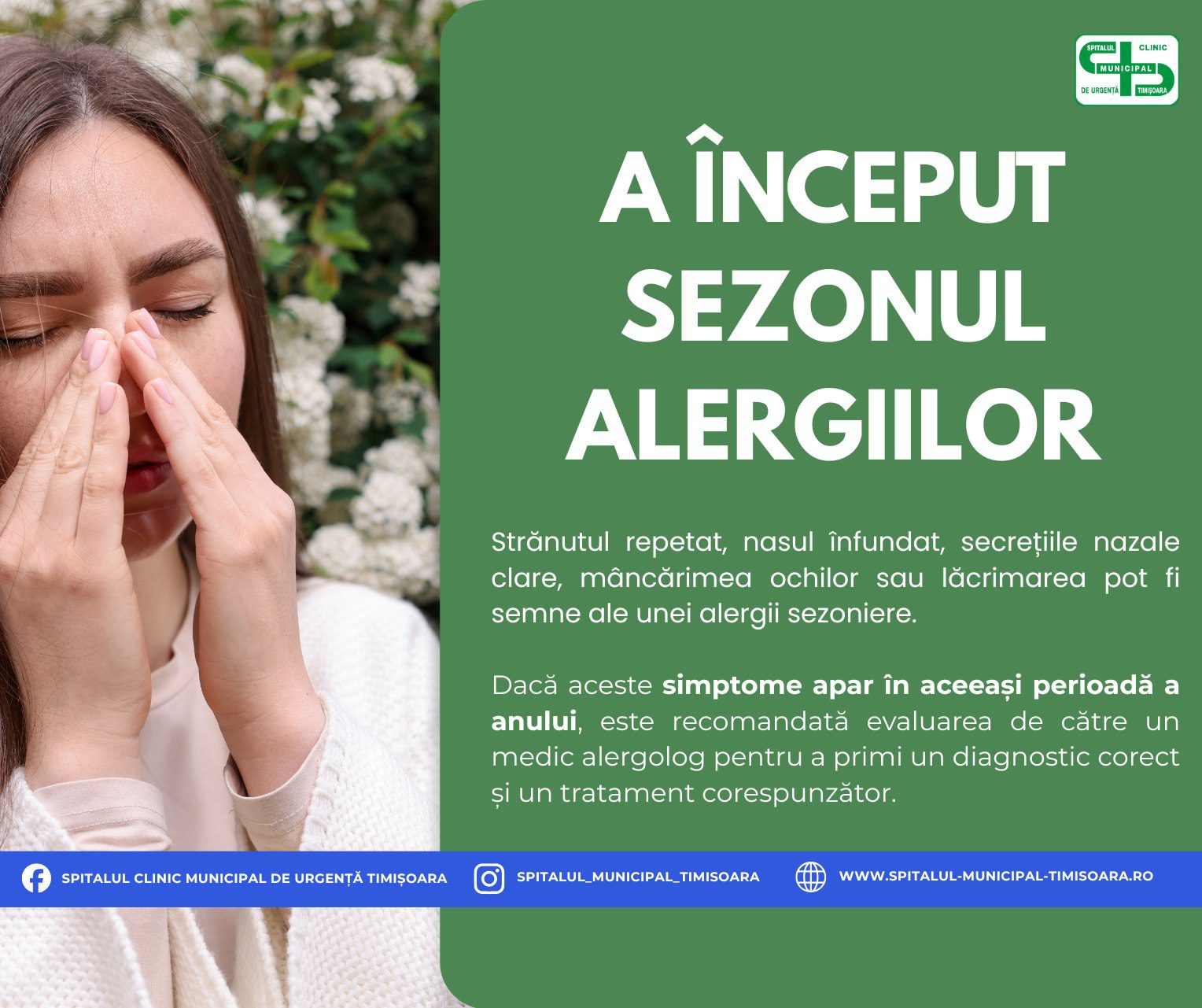Spitalul Clinic Municipal de Urgență Timișoara atrage atenția asupra începerii sezonului alergiilor, odată cu apariția polenului în aer, care provoacă strănuturi repetate, nas înfundat sau mâncărime la nivelul ochilor.