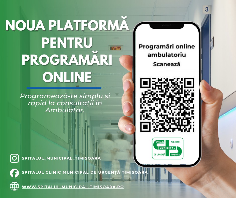 De astăzi, 1 aprilie 2026, pacienții Spitalul Clinic Municipal de Urgență Timișoara pot să își facă programări online pentru consultații și investigații în Ambulator, prin noua platformă digitală pusă la dispoziție de unitatea medicală.